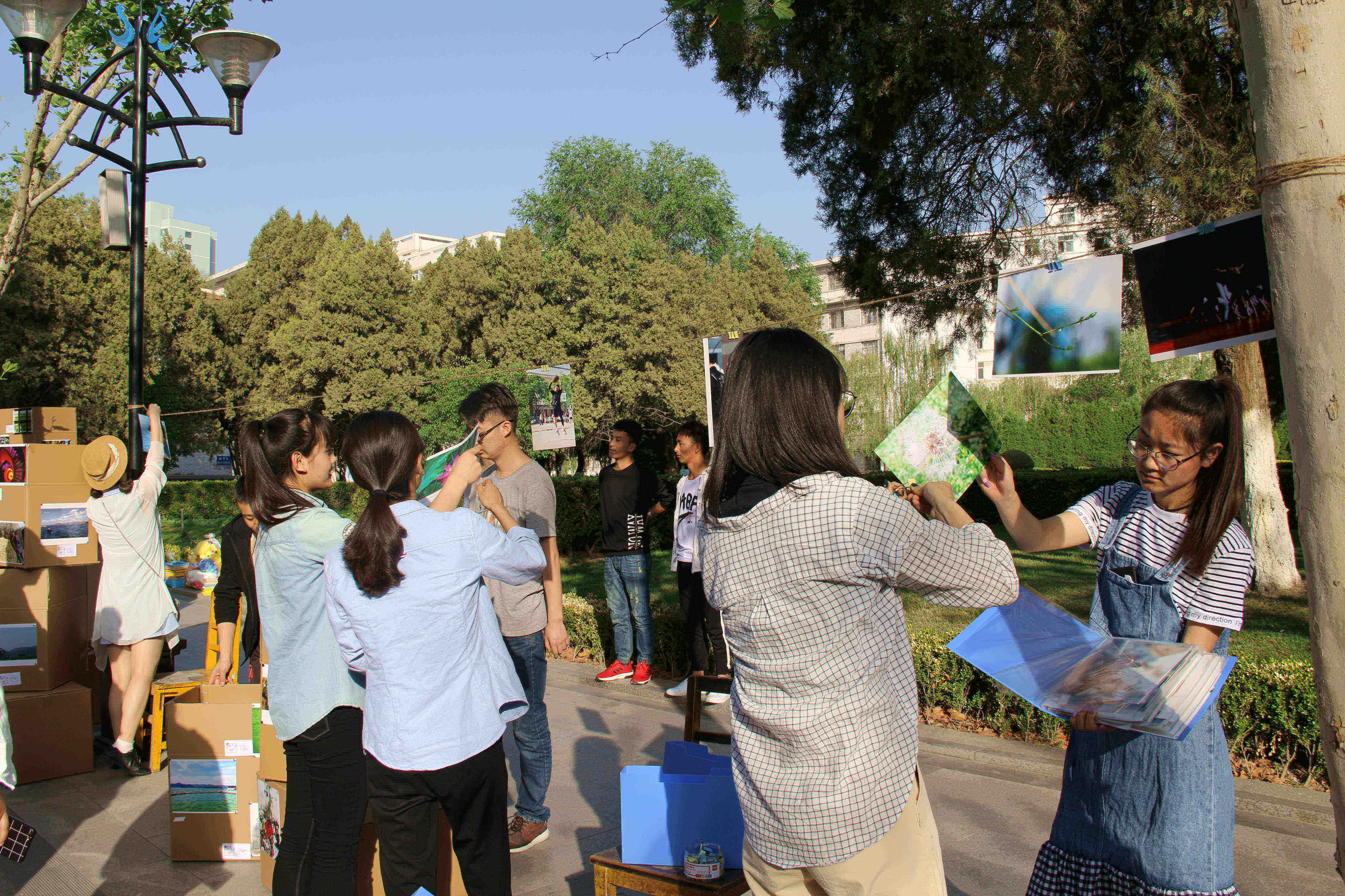 2018年5月14日7点40分,在校本部七号楼对面出现了一堆造型各异的纸箱,在这些或高或低的纸箱上贴着丰富多彩的照片。有气势磅礴的壮丽河山、有别具一格的街拍、有未来感十足的建筑、有绚丽多彩的夜景、有俏皮可爱的人物。时间倒回一个小时前,英国上市公司365软件学院摄师九度摄影摄像协会的同学们开始为第六届 “影像解世界,镜头记时光”摄影展搭建这些造型各异的纸箱。